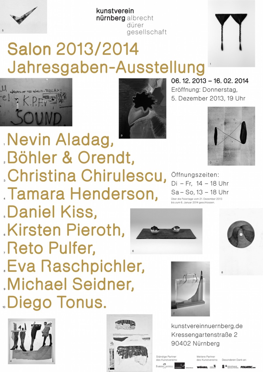 Mit Werken von: Nevin Aladag, Böhler & Orendt, Christina Chirulescu, Tamara Henderson, Daniel Kiss, Kirsten Pieroth, Reto Pulfer, Eva Raschpichler, Michael Seidner, Diego Tonus
