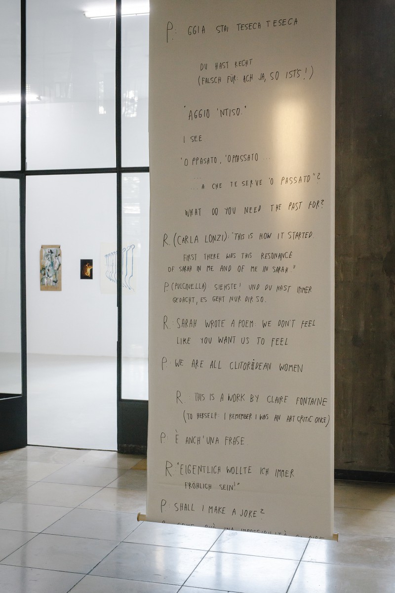 Carla Lonzis' Diario di una femminista describes a very similar search for an exit. Encapsulated by the concept of Separatismo, Italian feminists in the mid-1970s decided to abandon the field, whichever field that might have been—art, politics, psychonalysis— and refuse participation in areas that women have been excluded from for centuries and in which they have always had to defend themselves. Agamben describes the moment in the comedy, in which all of the protagonists leave the scene according to the parabasis of Greek comedy. The parabasis is the part of the play, in which the chorus takes off its mask in the absence of the acting characters and addresses the audience directly. It is the same moment in which Pulcinella later delivers a joke about what is happening.