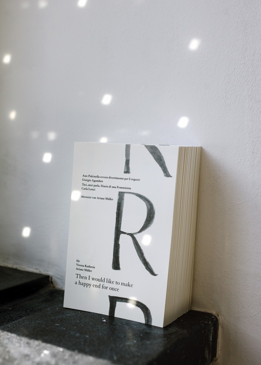 Then I would like to make a happy end for once ist eine Ausstellung für den Kunstverein Nürnberg, die auf einem Dialog zwischen der Fotografin Verena Kathrein und der Künstlerin und Autorin Ariane Müller basiert, der vor zwei Jahren in Rom begann. Die Ausstellung ist zum einen eine Auseinandersetzung mit dem Medium der Fotografie, ihrer Präsenz und ihrer Entscheidung für den Moment, und es ist ein Ineinanderfalten von zwei Feldern, dem der Komödie und dem des Feminismus. Es sind auch zwei Personen oder Figuren, die sich in dieser Recherche begegnen: Die italienische Feministin Carla Lonzi, die in den 70er Jahren gemeinsam mit der Künstlerin Carla Accardi die Rivolta Femminile gründete und die Figur des Pulcinella, der in der Commedia dell'arte für die Stadt Neapel steht und dem Giorgio Agamben 2015 ein Buch gewidmet hat. Die gemeinsame Lektüre und die Übersetzung von Lonzis Diario di una femminista und Agambens Pulcinella ovvero divertimento per li regazzi, die beide bisher noch nicht ins Deutsche übersetzt wurden, stand am Ausgangspunkt einer Recherche mit dem Ziel, Bilder zu finden, für etwas, das entweder zu traurig ist, als dass man es sagen kann, oder aber zu komisch, als dass man es aussprechen kann. Am Rand der Sprache findet sich denn auch das Weinen oder Lachen, in das sich die Sprache in der Unmöglichkeit, etwas zu sagen, auflöst und damit jene Gefühle, die das unfreiwillige Gefangensein beschreiben, in einem Drama der gesellschaftlichen Positionierung des Anderen aufgrund von zugeschriebenen, unentrinnbaren Unterschieden.