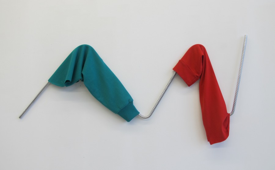 Als Jahresgaben hat uns die Künstlerin vier ähnliche Unikate zur Verfügung gestellt, die ihre Beschäftigung mit an Gebäuden montierten gerasterten Gittern aus Bewehrungsstahl fortführen. Die Fensterbarrieren sind dabei oft die Stellen, an denen das Alltagsleben der Bewohner/innen im Außenraum sichtbar werden kann. Wie in anderen Werken der Künstlerin weist die Arbeit »You keep me hanging from the Rooftop« auf die temporären Nutzungen dieser Strukturen als Garderoben, Wäscheaufhänger oder andere Funktionsträger hin. Die Abwehrfunktion der Sperre wird mit den abgeschnittenen Pullover-Ärmeln in einen Moment der Kontaktaufnahme zwischen Menschen überführt: Obwohl die reale Körperlichkeit zu den Stoffhüllen fehlt, deutet die skulpturale Anordnung die Bewegung des Handreichens, Händchenhaltens oder der Handhaltung beim Paartanz an. Die Zweckmäßigkeit und Beständigkeit des Armierungseisens wird so durch die Dimension der gelebten Beziehungen und improvisierten Gesten aufgehoben.