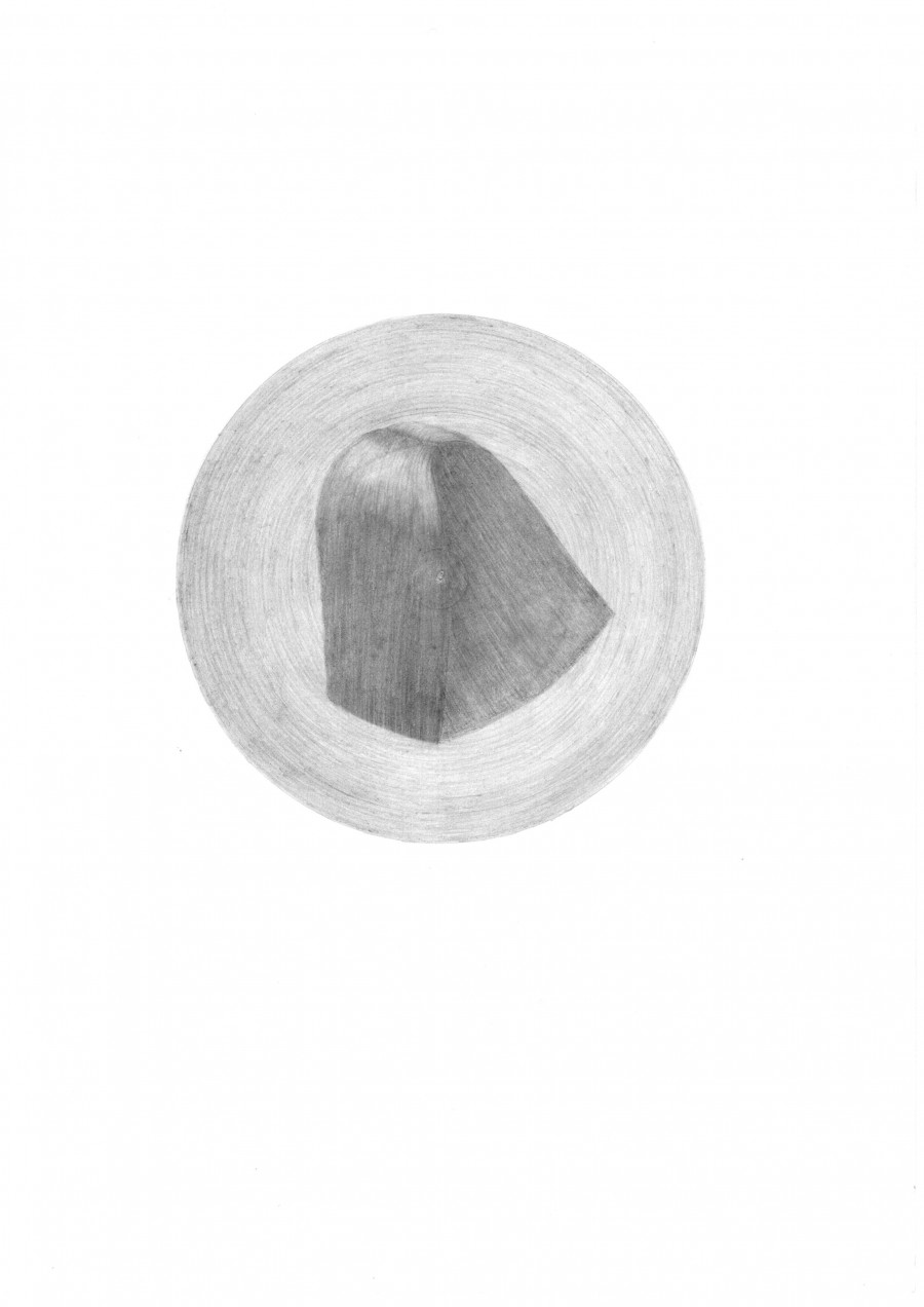 Die drei DIN A4-Arbeiten, die Eva Raschpichler zur Jahresgaben-Ausstellung beisteuert, gehören zu den Zeichnungen, die selbstständig zu verstehen sind. Ihren Ausgangspunkt haben sie in der Affinität der Künstlerin zur Musik und zum Tanz. Obwohl die Darstellung abstrakt bleibt – die Komposition besteht aus einer schraffierten Kreisform, die von amorphen Silhouetten überlagert wird – erinnert das Motiv stark an die Scheibe einer Schallplatte sowie die darüberliegenden Schatten an Haarfrisuren. Die Schraffur und die Kontur der Frisuren evozieren eine Bewegung, als ob jemand gerade zu Musik tanzen würde. Auf diese Weise machen die Zeichnung einen zeitlichen Ablauf oder eine Handlung wahrnehmbar und nähern sich den Videoarbeiten an, die sich meist auf reduzierte visuelle Effekte und Veränderungen konzentrieren.