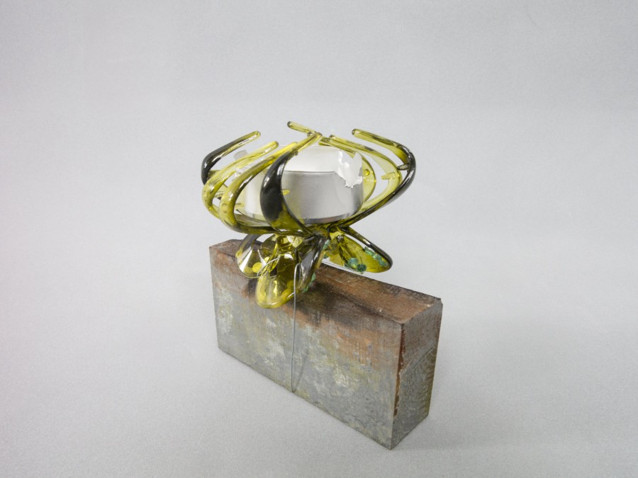 Für die Jahresgaben hat uns Katharina Cameron, die letztes Jahr ihr Studium an der Akademie der Bildenden Künste Nürnberg abgeschlossen hat und derzeit in Rotterdam am Piet Zwart Institute den Master absolviert, eine Aschenbecher-Skulptur zur Verfügung gestellt. Auf ein mit Wachs eingefärbtes Holzstück hat sie eine moosgrüne, leicht durchscheinende Haarklemme montiert, die ein ausgebranntes Teelicht umgreift. In der unerwarteten Verbindung von organischen und künstlichen Elementen, Wegwerfprodukten und Modeschmuck zeigt sich, wie unsere Assoziationskraft durch bestimmte Objekte aktiviert wird. Ausgehend von einem aktuellen Projekt im Künstlerinstitut »De Ateliers« in Amsterdam ist die Arbeit eine zeitgenössische Antwort auf das Gemälde »Christ in Limbo« (ca. 1575, Indianapolis Museum of Art) nach Hieronymus Bosch. Ihre Skulptur nimmt die Farbigkeit des Bildes, aber auch dessen gewaltsame Momente mit der Vielzahl von abgebildeten Spießen und invasiven Greifbewegungen auf. Durch die fragilen und temporären Materialien löst sich dabei das Motiv einer möglichen »Vorhölle« in Camerons Skulptur in einer unabgeschlossenen Geste auf.