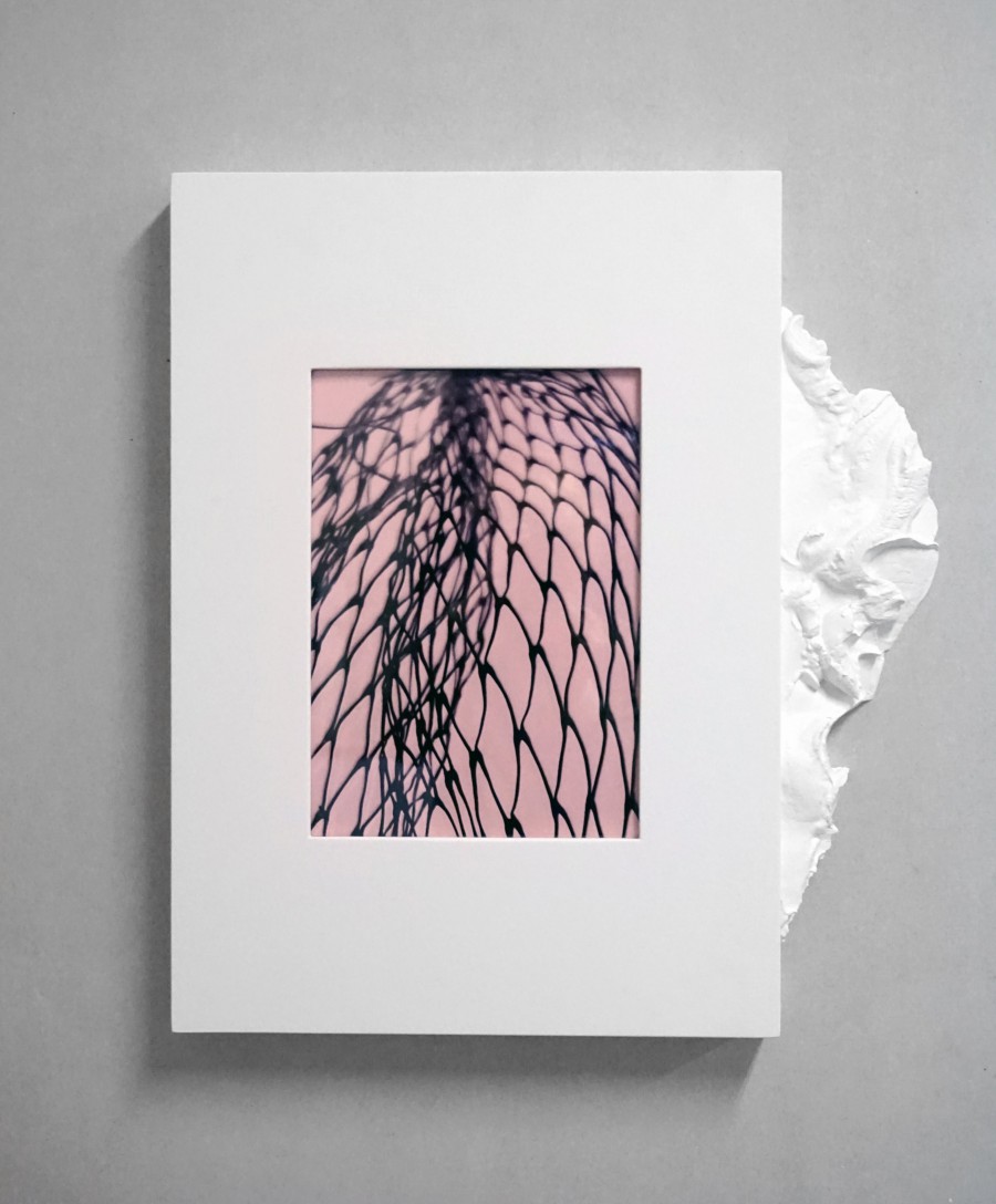 Als Jahresgabe hat Manuela Leinhoß, die im Kunstverein Nürnberg von Juni bis August 2016 die Einzelausstellung WOMEN FOOD AND GOD gezeigt hat, fünf ähnliche Unikate zur Verfügung gestellt, die ihre individuelle Arbeitsweise mit Skulptur, Bild und Fotografie zusammenführen. Ihre künstlerische Auseinandersetzung mit skulpturalen Repräsentationsmitteln wie Sockeln, Rahmen und Bildträgern überführt Leinhoß auch hier in eine Bewegung zwischen starrer Fixierung und veränderlicher Flexibilität. Der feste Bildrahmen aus Holz erhält eine taktile, anthropomorphe Erweiterung durch die gegossene und von Hand bearbeitete Form aus Gips. Zudem tritt die fragile Gipsfläche visuell mit der gerahmten Fotografie des Netzes in Kommunikation, das vor dem rosa-farbenen Hintergrund Referenz zum menschlichen Körper aufnimmt. Assoziativ ruft das Close-up der Netzstruktur unterschiedliche Momente des Festhaltens, Auffangens und des Schützens genauso wie der Durchlässigkeit und Vergänglichkeit auf.