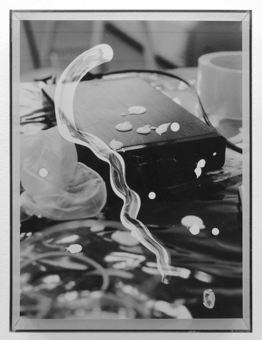 Auch in ihren fotografischen Arbeiten bedient sich Sanda Vaka Olsen häufig einer taktilen Technik, bei der sie mit Sonnenmilch Spuren auf dem Fotopapier hinterlässt, bevor sie dieses belichtet. Die zwei Schwarz- Weiß-Fotografien aus der Serie »Sunscreenpill«, die Sandra Vaka Olsen uns als Jahresgaben zur Verfügung gestellt hat, beruhen aus diesem Verfahren. So zeigt die hier abgebildete Arbeit die Situation im Atelier der Künstlerin, in welcher eine Festplatte auf dem Schreibtisch mit Tropfen von Creme und Rückständen weiterer Flüssigkeiten verunreinigt ist. In mehrfachen Arbeitsschritten setzt Olsen hier der oft suggerierten Immaterialität und Körperlosigkeit der digitalen Technik eine unmittelbare und gestische Manipulation im Medium der analogen Fotografie entgegen.