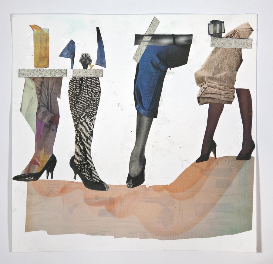 Tamara Henderson, die diesen Frühling im Kunstverein ihre erste institutionelle Einzelausstellung präsentiert hat, übergibt uns drei Collagen: Sie fungieren als Entwürfe für den Szenenaufbau eines neuen 16mm Films, an dem sie zurzeit gemeinsam mit der Künstlerin Jeannine Han in New York arbeitet. In Hendersons Kurzfilmen beginnen meist selbst gefertigte oder gefundene Objekte, sich von alleine zu bewegen und Kontakt mit der Umgebung aufzunehmen. Mit einfach gewählten Techniken und Materialien setzt die Künstlerin eine Choreografie in Gang, in der sich die Dinge in einer Struktur zwischen Ordnung und Zusammenbruch bewegen. In den Collagen vereinen sich ebenfalls in einem turbulenten Kabarett bekleidete Damenbeine, Stiletto-Schuhe, Jeans-Stoffmuster mit Ausschnitten von architektonischen Fragmenten und Werbeanzeigen. Die Kompositionen extrahieren aus den Körper- und Materialkonstellationen unerwartete abstrakte Formen, welche die unterschiedlichen Zeit- und Raumebenen im Bild zusammenfallen lassen.