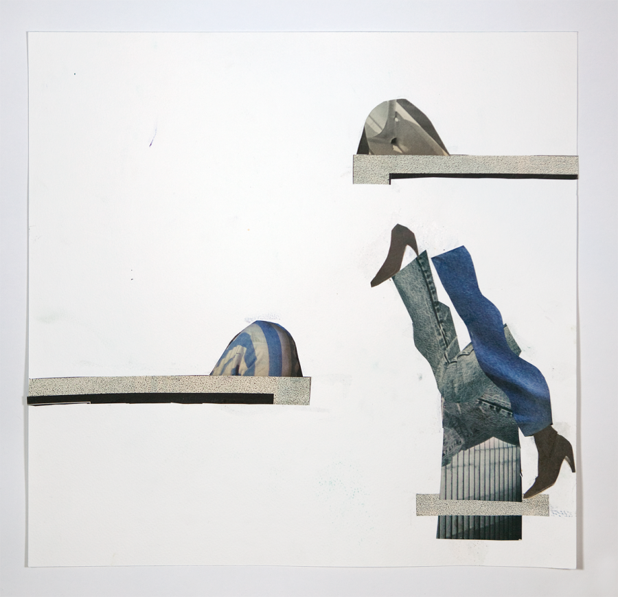 Tamara Henderson, die diesen Frühling im Kunstverein ihre erste institutionelle Einzelausstellung präsentiert hat, übergibt uns drei Collagen: Sie fungieren als Entwürfe für den Szenenaufbau eines neuen 16mm Films, an dem sie zurzeit gemeinsam mit der Künstlerin Jeannine Han in New York arbeitet. In Hendersons Kurzfilmen beginnen meist selbst gefertigte oder gefundene Objekte, sich von alleine zu bewegen und Kontakt mit der Umgebung aufzunehmen. Mit einfach gewählten Techniken und Materialien setzt die Künstlerin eine Choreografie in Gang, in der sich die Dinge in einer Struktur zwischen Ordnung und Zusammenbruch bewegen. In den Collagen vereinen sich ebenfalls in einem turbulenten Kabarett bekleidete Damenbeine, Stiletto-Schuhe, Jeans-Stoffmuster mit Ausschnitten von architektonischen Fragmenten und Werbeanzeigen. Die Kompositionen extrahieren aus den Körper- und Materialkonstellationen unerwartete abstrakte Formen, welche die unterschiedlichen Zeit- und Raumebenen im Bild zusammenfallen lassen.