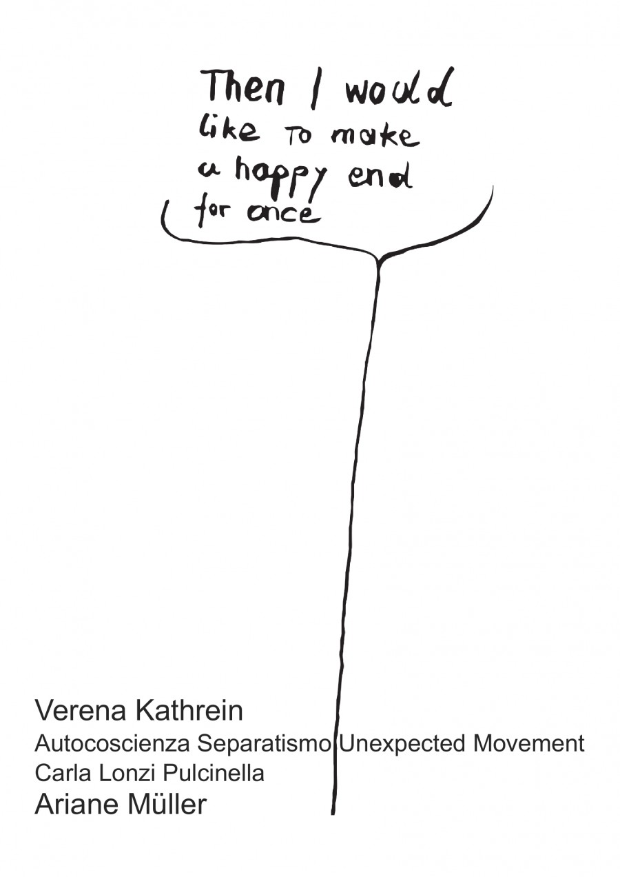 Then I would like to make a happy end for once ist eine Ausstellung für den Kunstverein Nürnberg, die auf einem Dialog zwischen der Fotografin Verena Kathrein und der Künstlerin und Autorin Ariane Müller basiert, der vor zwei Jahren in Rom begann. Die Ausstellung ist zum einen eine Auseinandersetzung mit dem Medium der Fotografie, ihrer Präsenz und ihrer Entscheidung für den Moment, und es ist ein Ineinanderfalten von zwei Feldern, dem der Komödie und dem des Feminismus. Es sind auch zwei Personen oder Figuren, die sich in dieser Recherche begegnen: Die italienische Feministin Carla Lonzi, die in den 70er Jahren gemeinsam mit der Künstlerin Carla Accardi die Rivolta Femminile gründete und die Figur des Pulcinella, der in der Commedia dell'arte für die Stadt Neapel steht und dem Giorgio Agamben 2015 ein Buch gewidmet hat. Die gemeinsame Lektüre und die Übersetzung von Lonzis Diario di una femminista und Agambens Pulcinella ovvero divertimento per li regazzi, die beide bisher noch nicht ins Deutsche übersetzt wurden, stand am Ausgangspunkt einer Recherche mit dem Ziel, Bilder zu finden, für etwas, das entweder zu traurig ist, als dass man es sagen kann, oder aber zu komisch, als dass man es aussprechen kann. Am Rand der Sprache findet sich denn auch das Weinen oder Lachen, in das sich die Sprache in der Unmöglichkeit, etwas zu sagen, auflöst und damit jene Gefühle, die das unfreiwillige Gefangensein beschreiben, in einem Drama der gesellschaftlichen Positionierung des Anderen aufgrund von zugeschriebenen, unentrinnbaren Unterschieden.